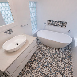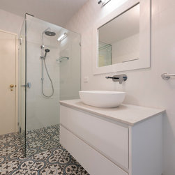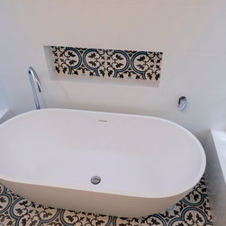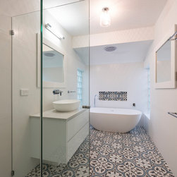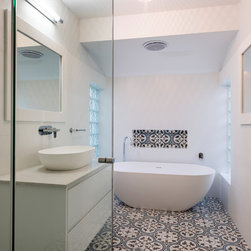 Once these beautiful tiles were chosen the bathroom evolved around them, leaving a clean white and bright bathroom with a stunning freestanding bath set in between two glass block windows, with a custom made vanity with a Caesarstone top to compliment this large bathroom, just stunning!
