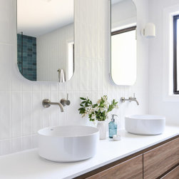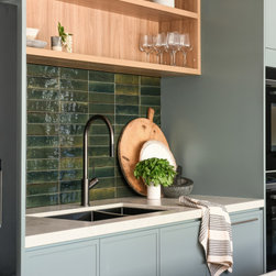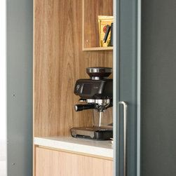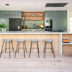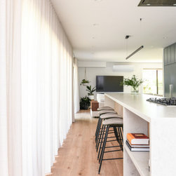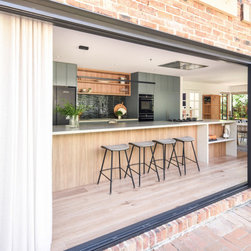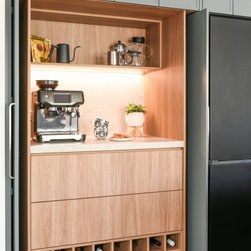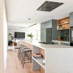 The kitchen was completely re-imagined, removing walls and opening up to the private garden with bi-fold doors. Our clients are passionate about cooking great food for family and friends, so we designed the ultimate cooks kitchen with a special shrine to coffee making. We freshened up the rest of the home with new engineered timber flooring, fresh paint, window treatments and lighting. With a stylish mudroom serving the front door area to keep school bags and beach gear tidy, we introduced some colour in a palette to suit the wonderful nature outside the front door.