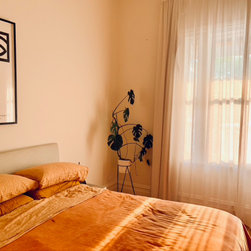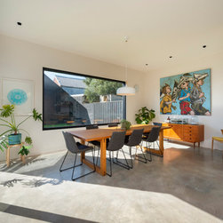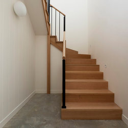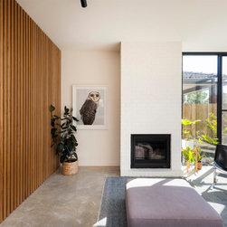 Custom terrazzo benchtop, oak veneer cupboards with hand pull cutouts for opening, curved walls with timber battens.