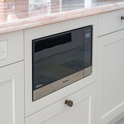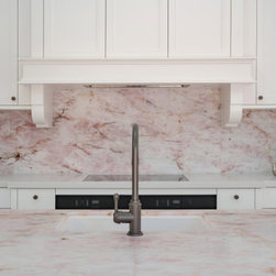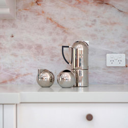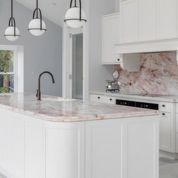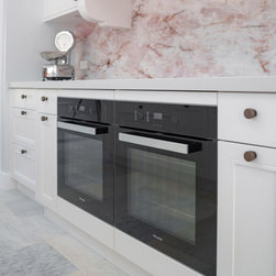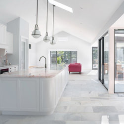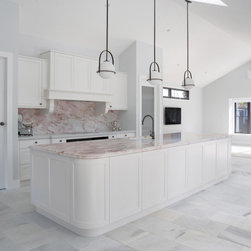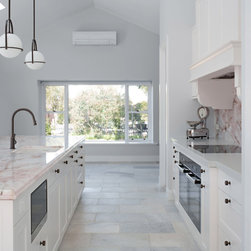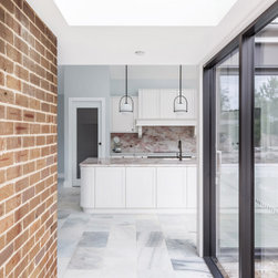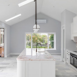 This Northmead kitchen by Dan Kitchens blends Federation charm with modern function. Shaker cabinetry, aged bronze details and a striking Pink Cristo Quartzite benchtop create a timeless yet contemporary space, perfect for a busy family of four.