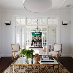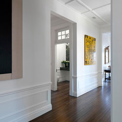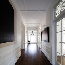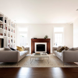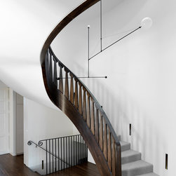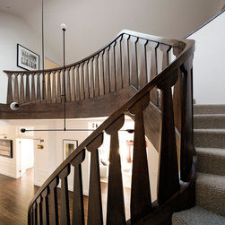 The original loggia that had been previously filled in was reopened, creating a light filled outdoor room that is straddled by the formal living spaces. The large original roof left many of the spaces at the heart of the home dark and a new elliptical stair, lit from above by a large skylight, chased away the shadows and provided some grandeur to the entry space. In the spirit of Asplund and Hardy Wilson the timber baluster appropriates the classical form of a Doric column.
