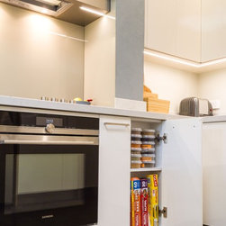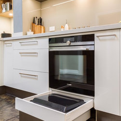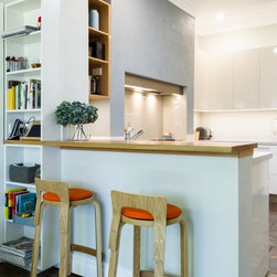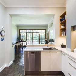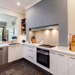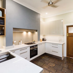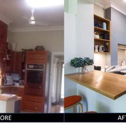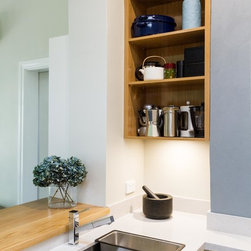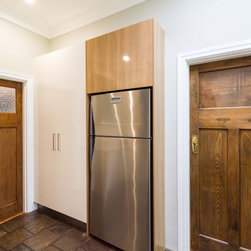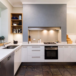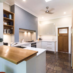 There is so much about this kitchen that draws the eye. Its style is mid-century (1950-60) with elements of vintage. The wooden doors, slate floor and chimney area all beautifully speak of eras gone by. It was important to the client to keep the chimney area as a feature, but update its style and function. The colors and textures work harmoniously with various levels of lustre to create a lighter, more functional and pleasant space in which to work, yet maintaining all pieces of special interest.