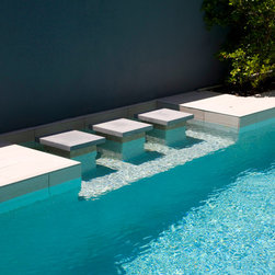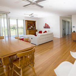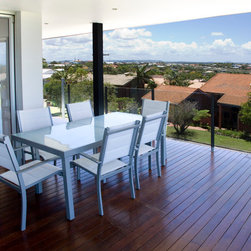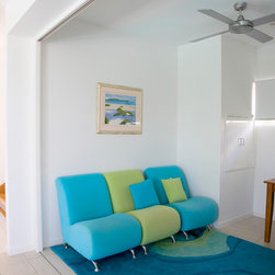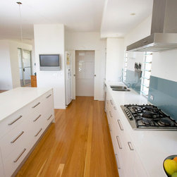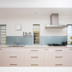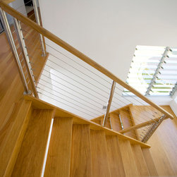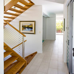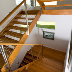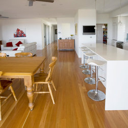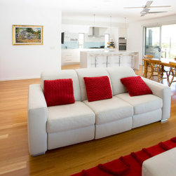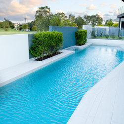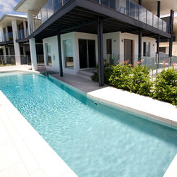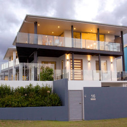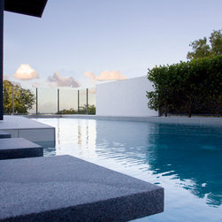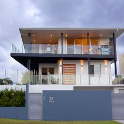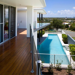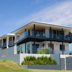 Gated access directs guests to the ground floor entry foyer. The lap pool provides a focal point from the foyer & living areas on both the ground & upper floor levels. The pool's geometric lines draws the eye towards the ocean view. The upper floor balcony profile aligns with the water line below, reflecting a ship's bow. The kitchen, living rooms, & master bedroom suite enjoy the magnificent views, unified by the wrap around verandah.