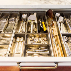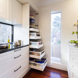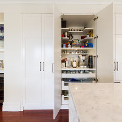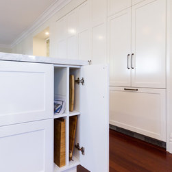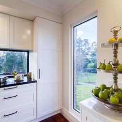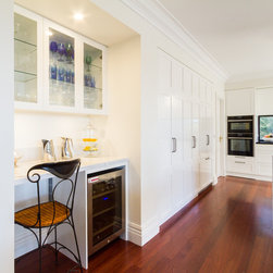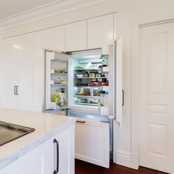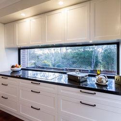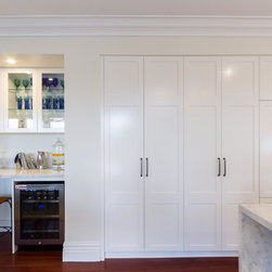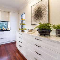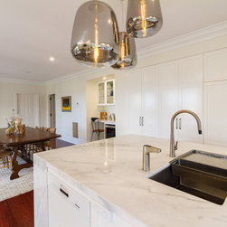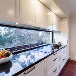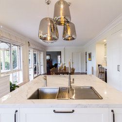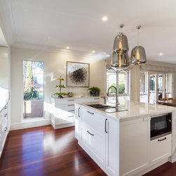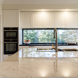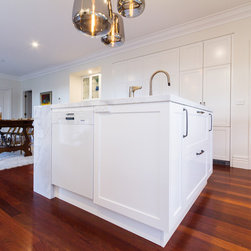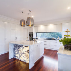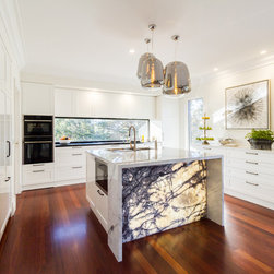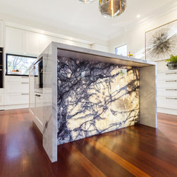 A beautiful, contemporary take on a traditional kitchen style. This kitchen has WOW-factor in spades and the stunning, back-lit, marble island back is only just the beginning. The marble was chosen to reference the trees outside the splashback window. A square island allows for easy traffic flow around the space and usable storage on the internal sides.