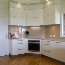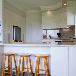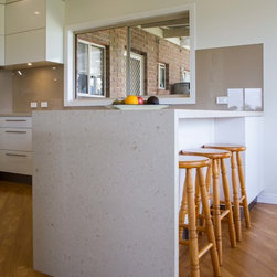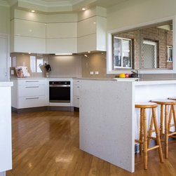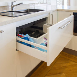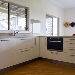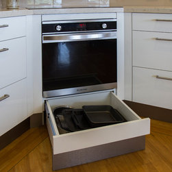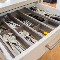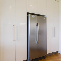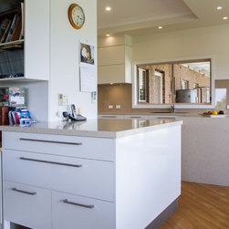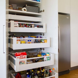 This is a small kitchen that has now been transformed to fit an adult family of 5. There is room to move and enjoy the space together! Our designer, Daniel Stelzer, was even able to cleverly add a home office station to the side to keep household clutter out of the kitchen space. It’s simple, clean lines make it contemporary yet timeless.