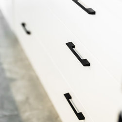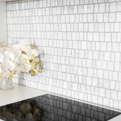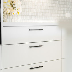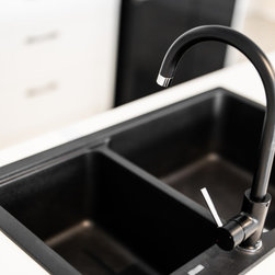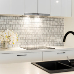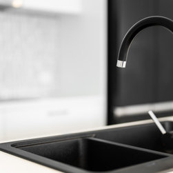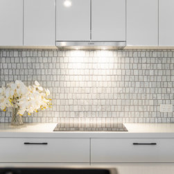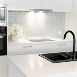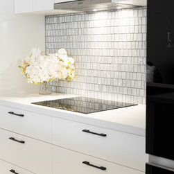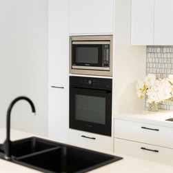 Drawing inspiration from the coastal setting, this kitchen features marble tiles with a rippled texture, echoing the movement of the ocean waves. Black metal appliances and fixtures create a striking contrast against the crisp white palette, adding a touch of luxury and sophistication.