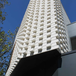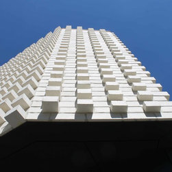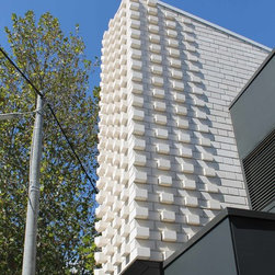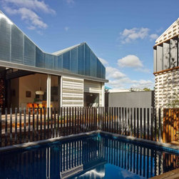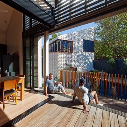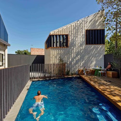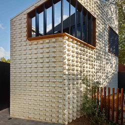 Just a stab pass from Melbourne’s legendary Victoria Park AFL ground is the Little Brick Studio, phase two of a comprehensive renovation of a Victorian-era timber cottage housing a family with two teenage boys. Its two street addresses were a trigger for the development of the Studio’s concept. Although the initial request was to renovate the existing house, the architects saw the opportunity to add value by building a multi-purpose studio above what would otherwise just been a garage. The white brick building references the heritage brickwork of the area while making its own contribution to the streetscape. A checkerboard of brick headers (ends) projects from the walling, creating an ever-changing shadowplay over the surface. In keeping with the “loose fit” sustainability concept, the TARDIS-like studio space can easily evolve with the family’s needs. The Little Brick Studio is a testament to the vision of the architects and their clients.