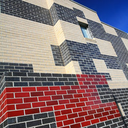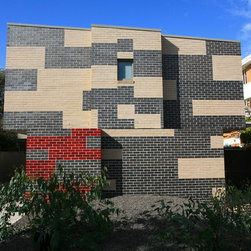 The architects were keen to minimize windows on the west face while maintaining articulation. This was achieved by articulating it predominantly in the finish with the use of brick patterning. The background of Austral Bricks Elements Zinc semi-glazed bricks contrasts with the much lighter tones of Urban One Nougat, both accented with a splash of red full-gloss bricks, similar to Austral Bricks Burlesque Luscious Red. This pattern wraps around the northern face but ends abruptly.