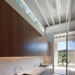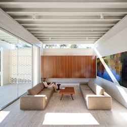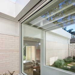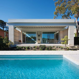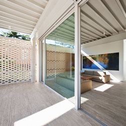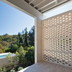 Situated in a Flame Zone overlooking a spotted gum forest, a non-combustible walling material was essential for this Northern Beaches family retreat. The owners wanted a white house but without the maintenance and upkeep of painted render. The solution was Bowral Bricks Charolais Cream, an off-white brick laid in a flush-finished light-coloured mortar. “Brick was an ideal solution, especially in terms of aesthetics,” says architect Tony Chenchow. The house is built in three volumes, linked by courtyards and constructed in full masonry, that is with brickwork inside and out. Some crosswalls are rendered and painted white as a backdrop to artworks, but there are substantial areas of face brickwork internally. The courtyards and sides of the pool terrace are sheltered from neighbouring properties by brick screens, also known as hit-and-miss brickwork, a simple technique that allows privacy without enclosure, and facilitates light and ventilation.