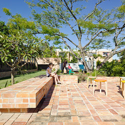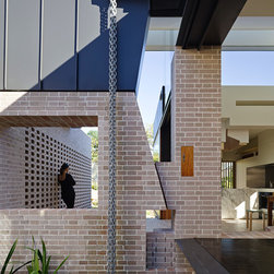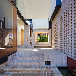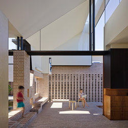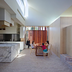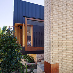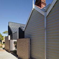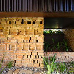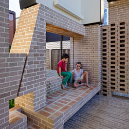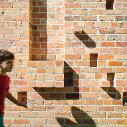 The owners of this 1890’s timber cottage –an architect and an interior designer – created a dramatic extension that weaves from the remodelled existing house, through a new pavilion accommodating a hall, bathroom, bedrooms, dining area and kitchen, and into the back garden. An original quarter-bond brick fireplace “anchored” the old building and became the extension’s starting point. The new work artfully uses brick to respond to light while defining boundaries and social spaces, creating edges to perch, responding to privacy, and addressing the garden. The brick walls and floors are patterned with quarter-bond variations along with hit-and-miss (perforated) walling and open perpends (the vertical gaps between bricks), blurring the distinction between internal and external space. The brickwork, predominately in Simmental Silver along with reclaimed bricks, captures an architecture that is responsive, connecting to its place and environment. The handcrafted brickwork creates geometries and forms, contrasting mass with void to create a sense of lightness and connection to site.