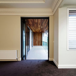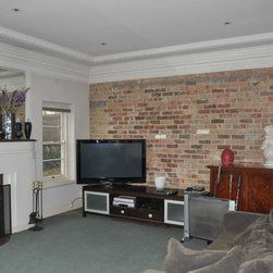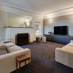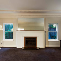 The 1930s double-storey brick home in Kew is considerably more modest in both scale and decoration than Burnham Beeches. However, it does come with some of the embellishments from this period: a curved stairwell, curvaceous built-in fireplaces, solid exterior and interior brick walls, together with deep cornices. There’s also symmetry in the location of windows and doors. The house had been previously renovated a few times before Naughtin was commissioned to remove some of the previous work and also add a new contemporary kitchen and living area to the rear.