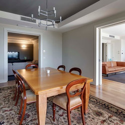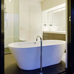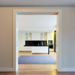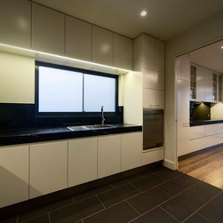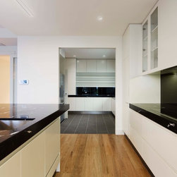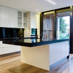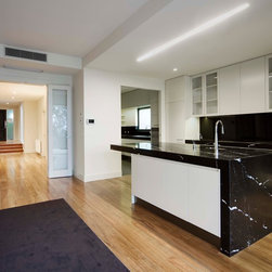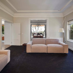 The kitchen itself draws its design cues from the 1930s, a time when graphic lines ruled the day. The central island bench, for example, features back marble on two sides, and this is also featured on the splashback which is framed by white MDF joinery inserted with two symmetrical glass-fronted cupboards (picking up on the symmetry in the original home). However, mindful of contemporary living and for a couple who enjoy entertaining, there’s also a large butler’s kitchen concealed to one side and a separate dining area for more formal occasions. “We were conscious of opening up the house, particularly at the rear, but we also wanted to keep the scale and detailing sympathetic to the original 1930s home,” says Naughtin, pointing out the wide bulkhead in the extension. “It creates that sense of solidity we inherited.” And should the owners want to create more intimate zones, there are double doors separating the old and new.