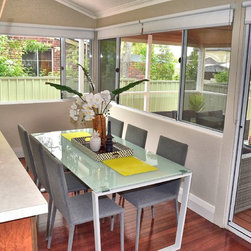 Dining room opening to decked outdoor entertaining with cedar lined roof