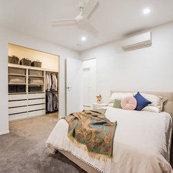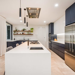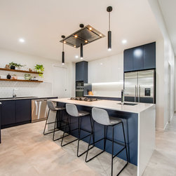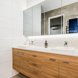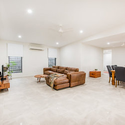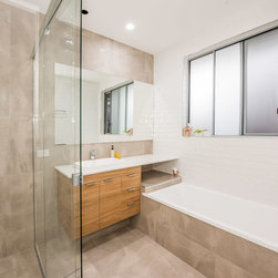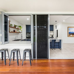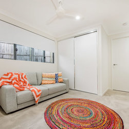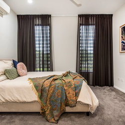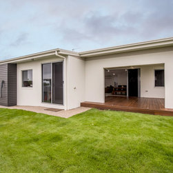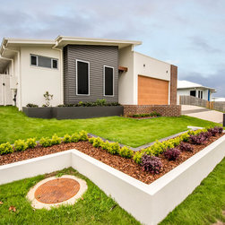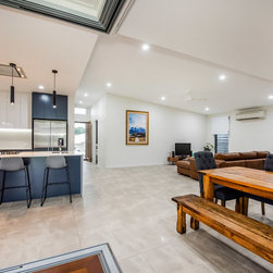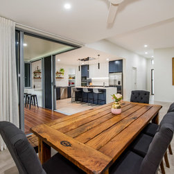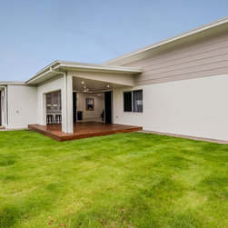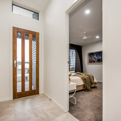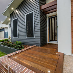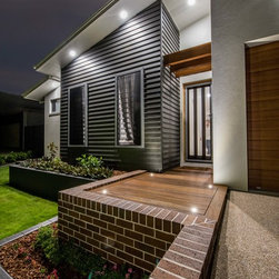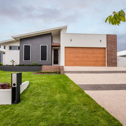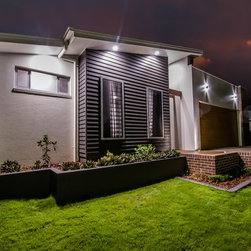 Street appeal was an important factor for the design of this home. The clients wished for a modern design that would appeal to most tastes, yet still be distinguishable from surrounding homes. The high ceilings in the front of the home allowed a highlight window and timber beam feature to the entry. The mixture of texture and materials in the front façade including smooth render, ‘Scyon – Stria’ horizontal lines, timber and metallic brickwork, creates an interesting and appealing look that the clients are extremely happy with.
