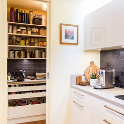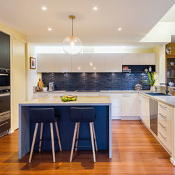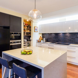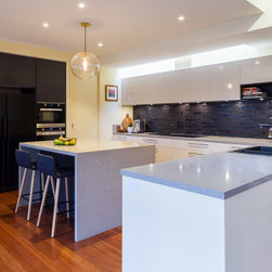 This stunning, contemporary kitchen is packed with practical design features and looks incredible. The elegant black details are blended perfectly with the Caesarstone benchtop and the light shaft over the cooktop bringing the space to life. The walk-in pantry has been fit out to work as a mini home office station, appliance pantry and food storage.