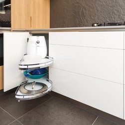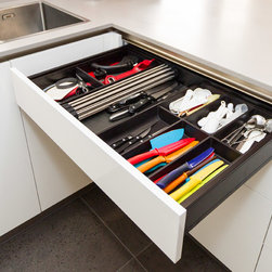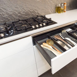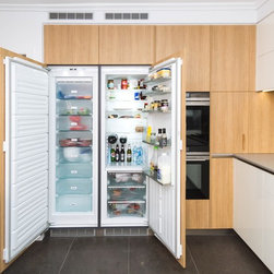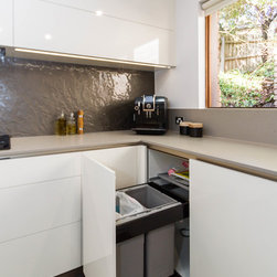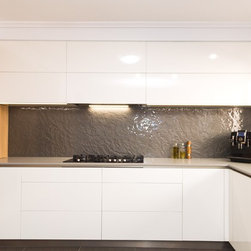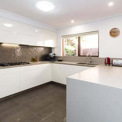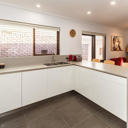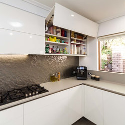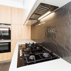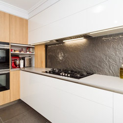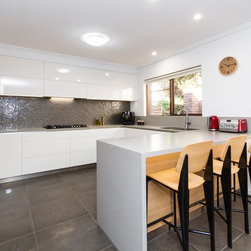 This contemporary kitchen has been planned simply and efficiently. The style is simple, with a touch of Scandinavian influence. The lines are sleek and stream lined. The color tones are subtle and blended with warm timber tones balancing the crisp of the cool white. The simplicity of the overall kitchen has caused the slumped glass splash back to draw the eye with its gentle, watery movement and reflection. All in all this is a very calm place to live and work.