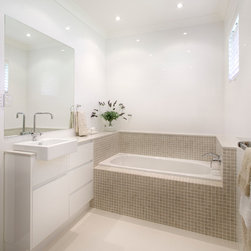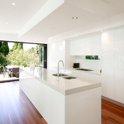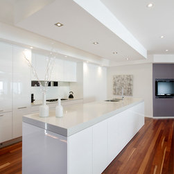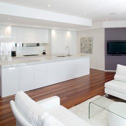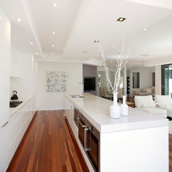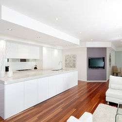 The design is centered on a sizeable island bench with a gorgeous stone top complete with mirror chips. Functioning as a large working zone, the island is perfect for communal cooking, The bench has been expertly positioned to conceal all the ‘behind the scenes’ action such as the ovens and microwave from visitors in the adjoining living room. There is even a hidden seating area for casual dining.