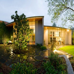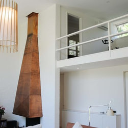 Original Roy Grounds feature of copper fireplace - now in two rooms.