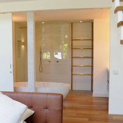 Two Roy Grounds apartments were joined to create a beautiful bedroom and en suite space for the owner as well as increasing the space upstairs for living and guests.