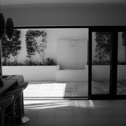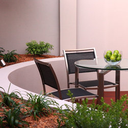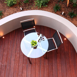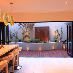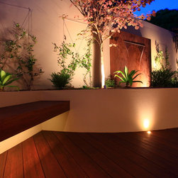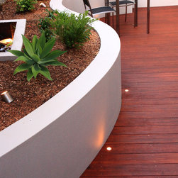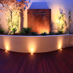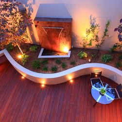 This garden is finished to the highest order, with clean lines and a strong design focus. It has a relationship with the home, whilst still having it own identity. The key to the space is the signature low wall, with its curvaceous lines. This provided a deeper a garden bed for deciduous tree planting (Cercis Canadensis), casual low seating walls, as well as the ability to cradle the water feature with strong planting lines (Agave, Hebe, Liriope). The installation of wide Bamboo flooring created a seamless connection to the home, with lighting to highlight the curve and seating.