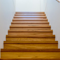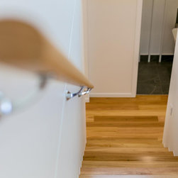 A pleasingly organic & obstructive palette of white surfaces, black butt flooring, timber and stone are used through out the new home creating a coherent design across the levels.
