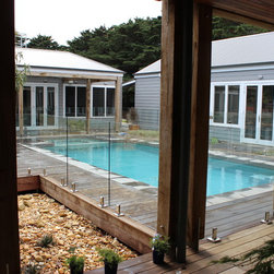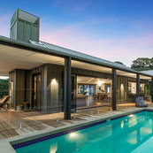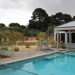 Pool and spa cut basalt coping fully tiled Weatherboard pool house with stone fireplace extensive timber decking and glass pool fencing large timber verandah posts
