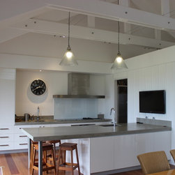 Board and Batten walling concealing butlers pantry, two pack painted cabinetry Miele appliances glass splashback stainless exhaust hood feature timber trusses vaulted ceiling