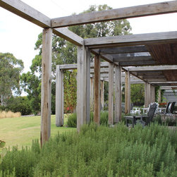 Deck pavilions separated by landscaped garden beds Pergola features large section 200 x 200mm white cypress timber with joint section shadow lines and concealed metal joint plates