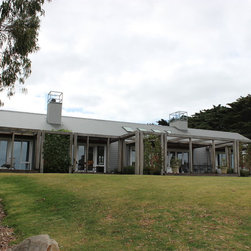Front exterior featuring decking separated by garden beds and 200 x 200mm white cypress pergola with connection joint shadow lines. Chimney intergration frames