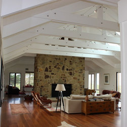 Main Living area grey box solid timber feature flooring Stone stacked fireplace feature Timber trusses constructed onsite stainless steel junction bolts lining board ceiling