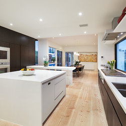 Modern open plan kitchen/dining, complete with calcutta breakfast bar, island bench and reconstituted timber veneer.