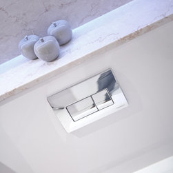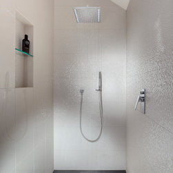 In keeping with the interior design of the home, the ensuite has been given a classy, elegant feel and features large format, reflective Cubica feature tiles laid horizontally along three walls to provide the illusion of extra width. The floor tiles were also laid horizontally to continue this theme. Frameless mirrored shaving cabinets create a reflective surface which expands the illusion of space while a night light keeps the room illuminated for overnight visits.