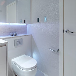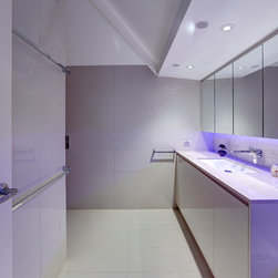 Botticino marble was chosen for the continuous benchtop and splashback while the under-mounted vessel basin sits perfectly next to the wall mixer basin set for ease of cleaning. Underfloor heating provides that element of comfort so needed in an ensuite while intelligent lighting design integrates with the CBus system which was already wired into the home. Audio speakers were installed in the ceiling to allow the owners to enjoy listening to music while getting ready or unwinding in the bathroom.