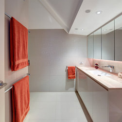 This bathroom renovation called for the reconfiguration of a dressing room adjacent to the main bedroom in an inner city 1890s bluestone cottage. Originally only two rooms, the cottage had been added to in the 1970s but the only bathroom was downstairs and not at all convenient to the main bedroom upstairs.