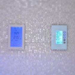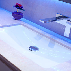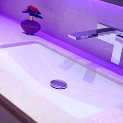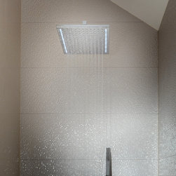 Lighting in this room was a major consideration because of the cathedral ceilings so the designer specified strip lighting under the shaving cabinets to create mood lighting which is managed via a remote control. Ceiling LED lights are complemented with LED lights within the showerhead which are powered by their own energy as water passes through the head.