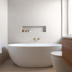 The oak floating vanity and mirror cabinet offers ample storage while contributing to the sense of openness by freeing up additional floor space. A large oval freestanding bath makes a beautiful statement piece, creating a sense of luxury and relaxation. Above the bath, a cleverly designed niche adds both style and functionality, completing the bathroom’s elegant and functional design.