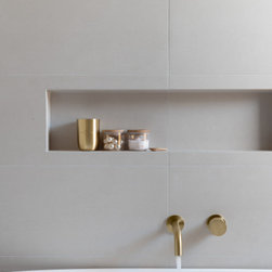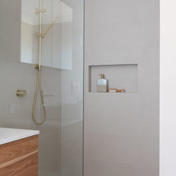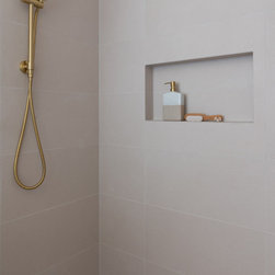 The use of warmer tones and full-height tiling gives the bathroom a luxurious, inviting feel, while brushed brass accents pop against the neutral tones, adding a touch of sophistication.
