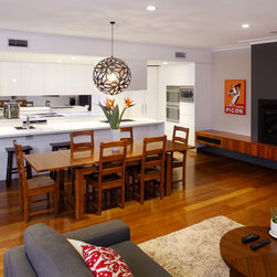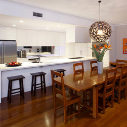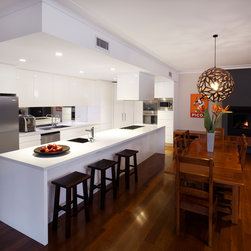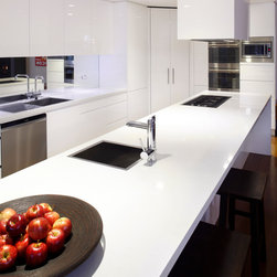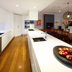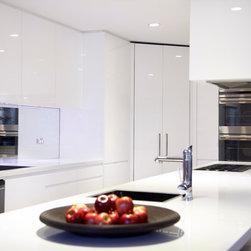 When the Art of Kitchens design team were faced with the difficulties of designing a modern kitchen in an area with no natural light, they rose to the challenge and produced an outstanding result. Stainless appliances, clever lighting, a mirrored splashback, and pure white cabinets and bench-tops create a bright, inviting kitchen in a space with no windows.