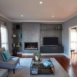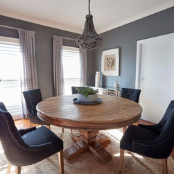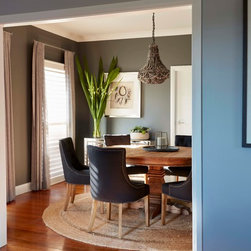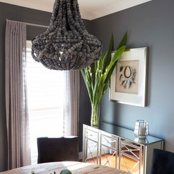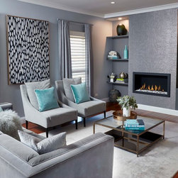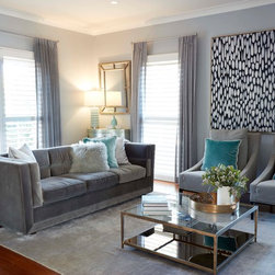 A wonderful opportunity to create a luxe lounge space for a professional couple seeking to create relaxing surroundings with some special edge. The dining room next door was also decorated in tandem, maintaining the sophisticated theme. Luxurious velvets, a stunning rug, eye catching artworks and elegant furniture provide a comfortable zone for relaxing after a long day at work. Custom designed joinery and fireplace keep things neat and tidy at the far end of the room. Window treatments add another layer of texture, completing this sophisticated space.