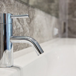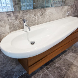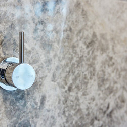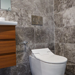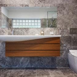 The travertine wall and floor tiles gives a feel of warmth, while the wall mounted vanity with a unique basin and wood finish cabinet brings all of the #Reece products together. The in-wall cistern toilet adds class to this overall stunning bathroom renovation.