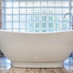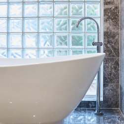 Another beautiful bathroom renovation which capsulate the ambiance with this free standing bath with floor mounted flick mixer, in front of this elegant glass brick window.