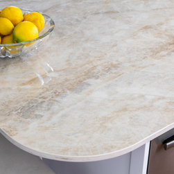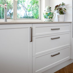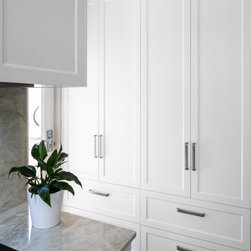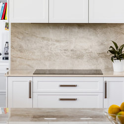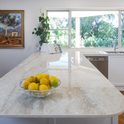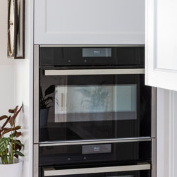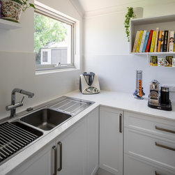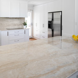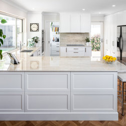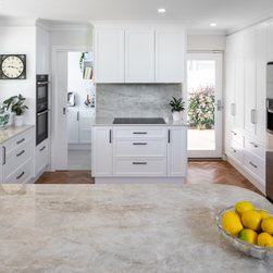Extra glossy Dekton Arga benchtops with 20mm edges - a real feature in this lovely light, bright kitchen in Como.