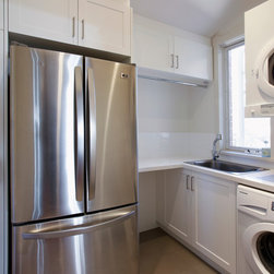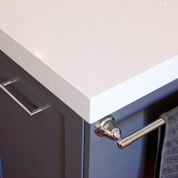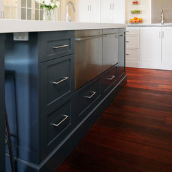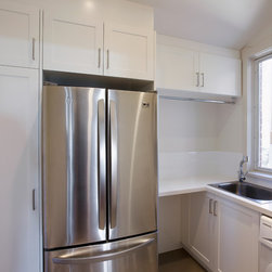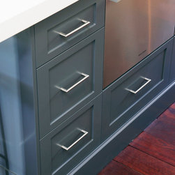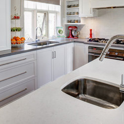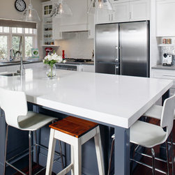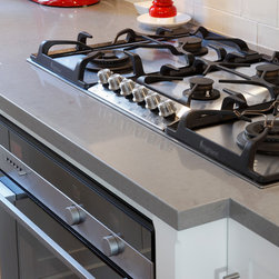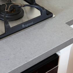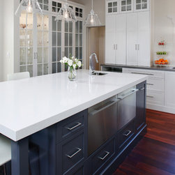 Caesarstone was used in this kitchen; the Island stone is Organic White (60mm edges), the other benches are Oyster (40mm edges). The contrasting colour for the cabinets on the island were lacquered to match Formica Storm.