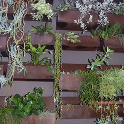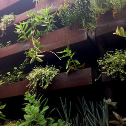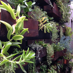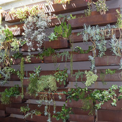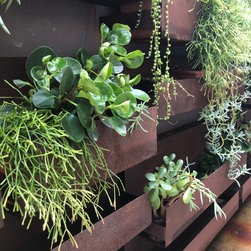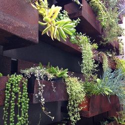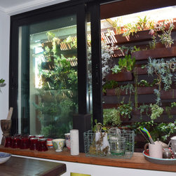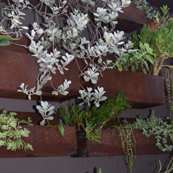 The kitchen looks directly out onto this half shady wall lined with corten steel troughs. Succulents cascade and soften the edges and contrast perfectly against the rusty patina.