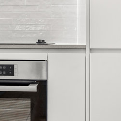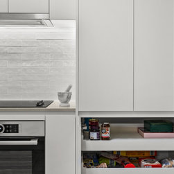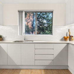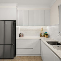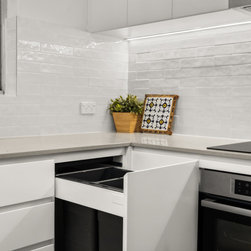 Replacement of original 1970s kitchen with new handle-less polyurethane kitchen. Included intregrated bin, pantry with internal drawers, LED strip lighting. FInish selections included Caesarstone Nordic Loft benchtops, subway tile splashbacks.