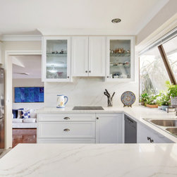 A relaxed Hampton's look was the perfect touch for this pretty kitchen. Teamed with the glass cabinets, the feel is sophisticated yet playful. Whilst not huge, this kitchen has everything required for a comfortable cooking experience: wall mounted ovens, spacious fridge, perfect work triangle, an appliance cabinet, plenty of storage, and a handy servery area. Mixing cup handles and knobs adds charm, and the beautiful Smartstone Imperial Grande on the benchtop and splashback adds a touch of lux. The feature windows make for a sunny and pretty outlook and give an atrium feel to the space. Very lovely indeed!
