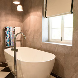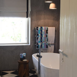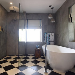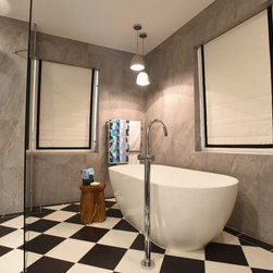 The classical black and white checkered floor tiles are a nod to tradition, age and heritage of the house, while the large format textured wall tiles, sleek chrome tapware and sumptuous free standing bath give the space a modern contemporary feel. The result is a light, bright and luxurious spa-like bathroom right in the heart of the Barossa.