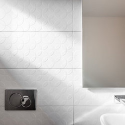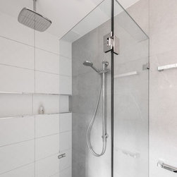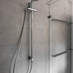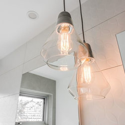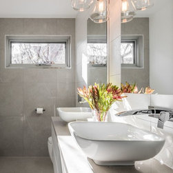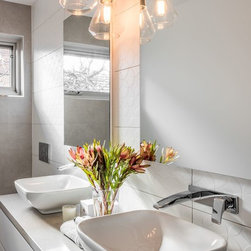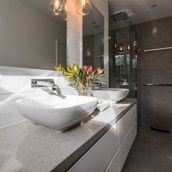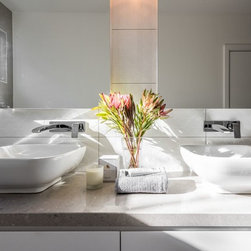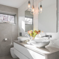 Stunning master ensuite created for clients wanting to escape to their tranquil haven after a working day. Beautiful stone inspired wall and floor tiles paired with a slightly feminine yet bold geo feature tile. Custom two pac cabinetry with 'Signature' waterfall end to one side. Concrete and glass pendants create interest and sophistication suspended over the 'his & her' vanity.