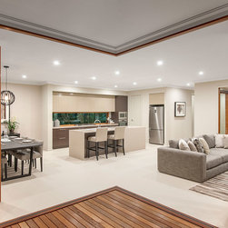 The first floor of this home design boasts a lavish kitchen, including a walk-in pantry and large island bench.