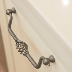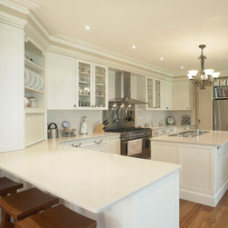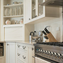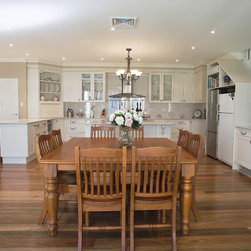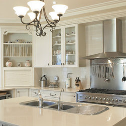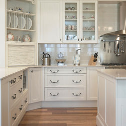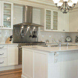 The serene beauty of this kitchen is immediately appealing. Large and expansive, with every element carefully attended to, it leaves nothing out. The fabulous rangehood, splashback and oven trio take center stage to set the mood. The subtle colour scheme is enhanced by the decorative details such as the corbels, French style handles, Shaker doors, proud-set kickplates on the island, glass wall units and fancy trims. The addition of an appliance cabinet next to the breakfast bar is a handy addition, as are the spacious drawers beneath it. The elegant pendant light, hand-made subway tiles, and country style furniture further enhance this charming kitchen.